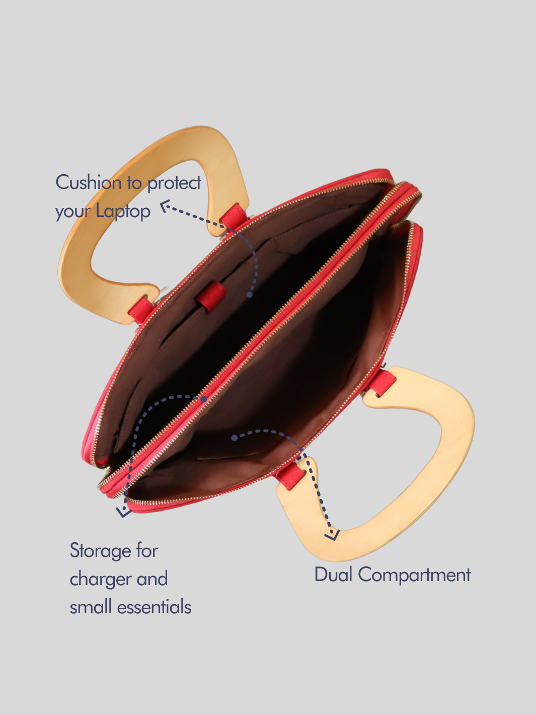 Discover the FOReT Luma Star Laptop Folio Bag, a masterpiece in ruby‑red canvas and gold‑fleck cork, with sculpted wooden handles that feel as natural as moonlight on your hand.  Its rich red canvas exterior is complemented by a handcrafted cork flap adorned with genuine gold flecks, creating an arresting visual contrast that catches the light from every angle. Accented by sculptural wooden handles and gleaming gold-tone hardware, the Luma Star folio is more than an accessory; it’s a statement of conscious luxury. Designed for the style-savvy professional, the structured silhouette holds your day’s essentials, from Laptop to wallet in thoughtfully arranged pockets. Whether paired with tailored suits or smart casual separates, this bag redefines everyday sophistication and underscores FOReT’s commitment to planet-friendly design.