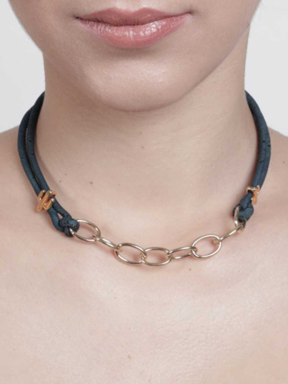 FOReT Arizona Necklace is striking and elegant. Handmade with Navy Blue Cork and Bold Gold chain, it is artisanal and exquisite.