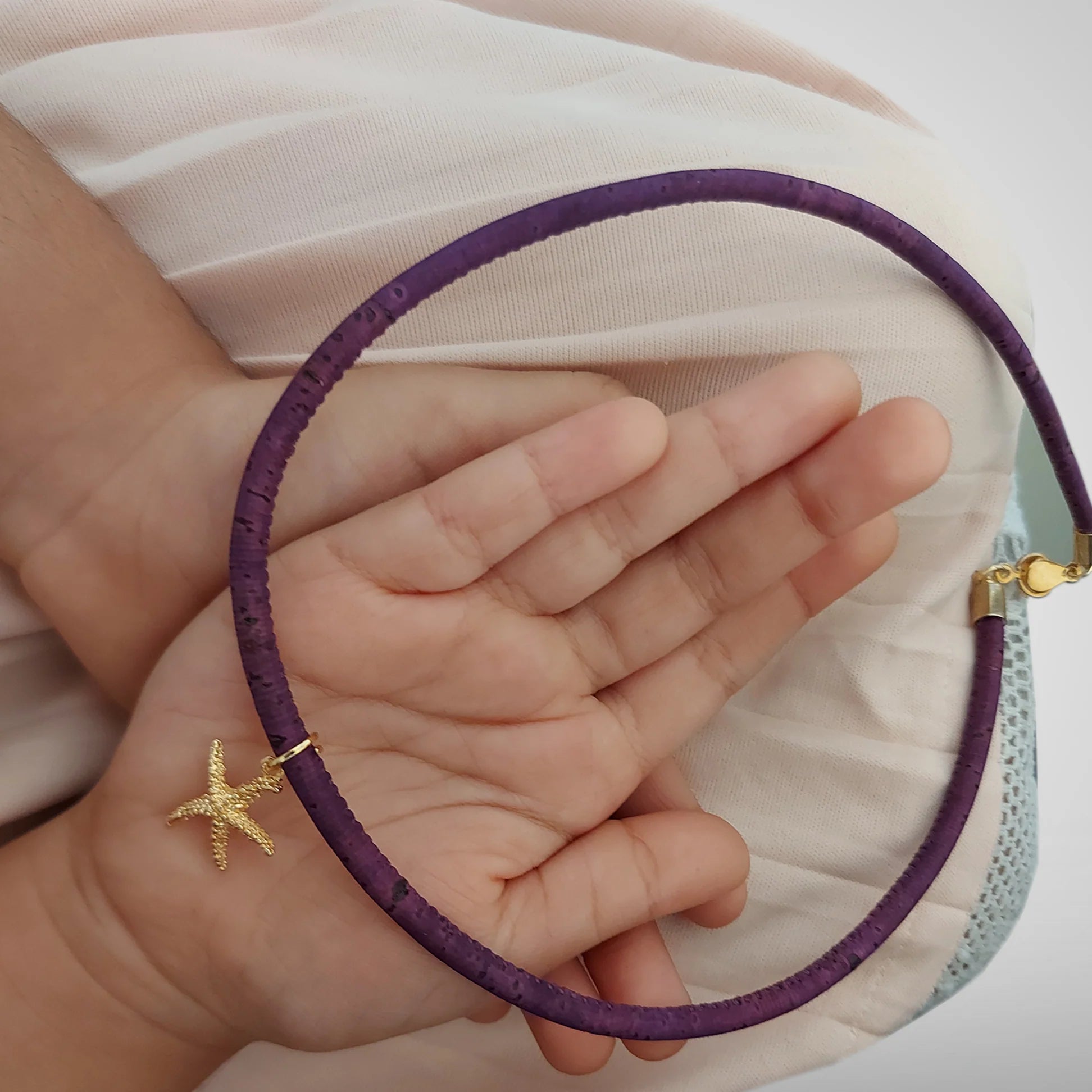 Handcrafted in cork and designed in ceramic beads to represent the memories of brighter skies, this subtle yet striking piece is designed to become part of your daily wardrobe, and take you to your happy blue space whenever you need to.